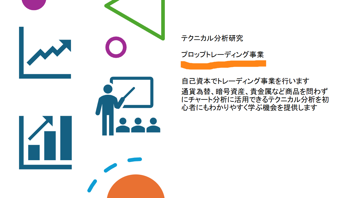 当社は革新的な技術フィンテックソリューションを提供する取引所を使い自社資金でデイトレードを行うプロップトレーディング企業です。自社で利用するテクニカル分析を使ったマーケットチャートの分析技術を公開し、顧客のトレーディング技術向上を目的とし、資産運用自助能力の向上を支援し”経済的独立=お金のために働かない生活”の実現を目指すトレーディング教育企業でもあります。またトレーディング事業によって生まれた新たな利益、剰余金は、現代日本が抱える社会問題の解決活動に対して融資、拠出、支援をする社会問題解決型の投資会社でもあります。