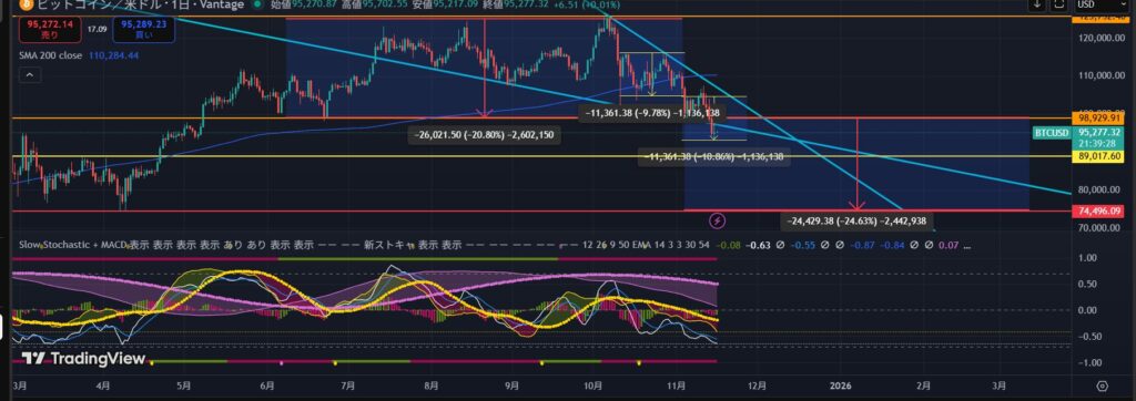 パターンの完成を目指す場合は、画面最安値の74496の赤いサポートラインが到達点予想候補の一つだ