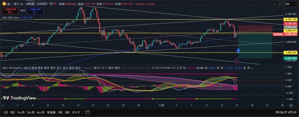 4245の戻り高値から急落、4050$付近の青色200日移動平均線で買い支えられ反転上昇