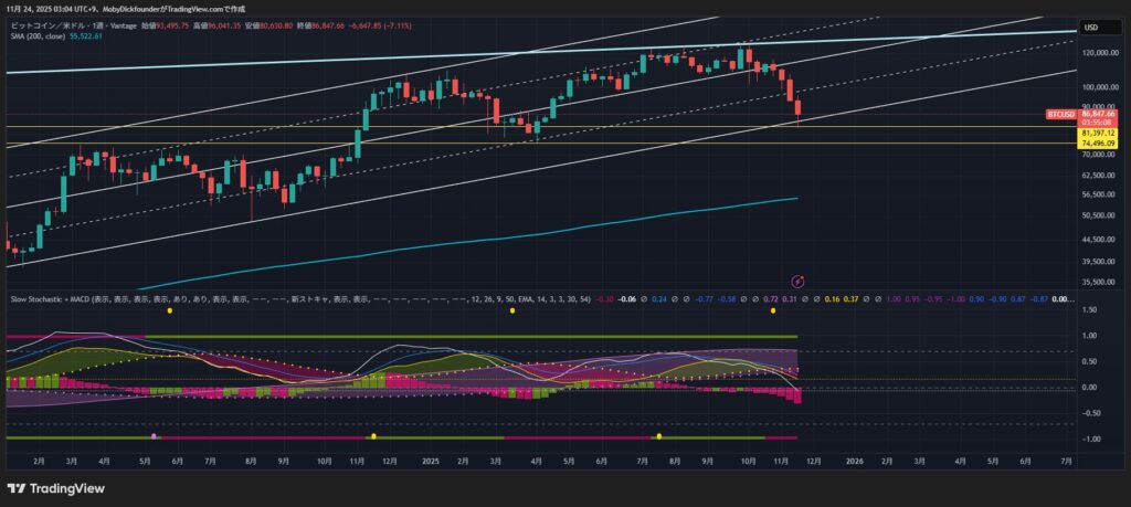 ここで一度価格が攻められ、フェイクアウトやストップ狩りによって一時的に下抜けが演出される可能性がある。 - 75,000ドル付近でロングテールを形成し反発