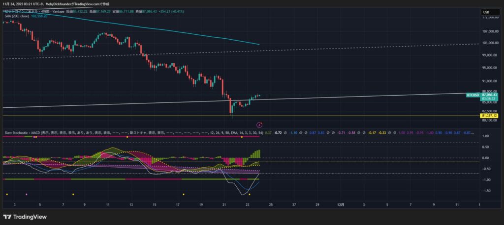 週足で引いた上昇平行チャネルに注目すると、現在のBTCはそのチャネル下限付近で一度下抜けを見せた後に反発し、4時間足に切り替えて見ると、短期的な押し目を作りながら高値更新を続けていることが確認できる。