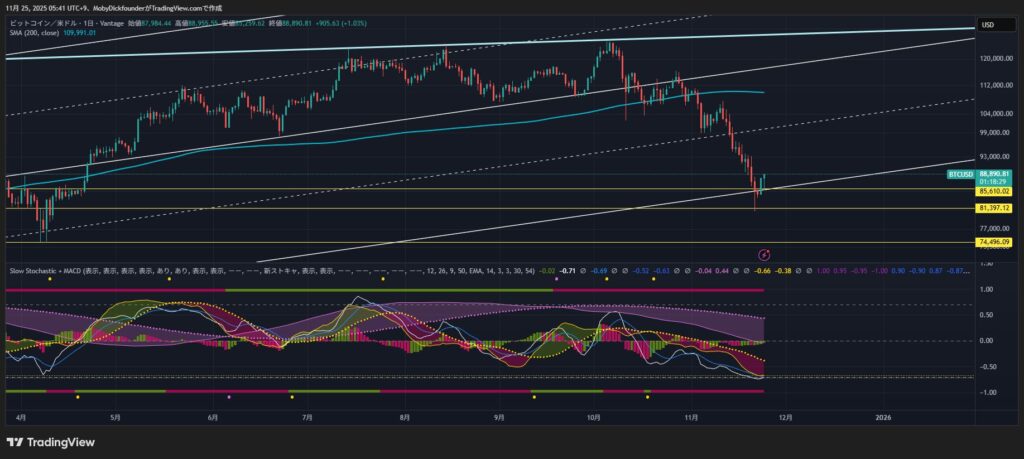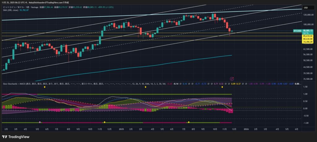 BTCは11月に入り続落し、一時7か月ぶりの安値圏へ。