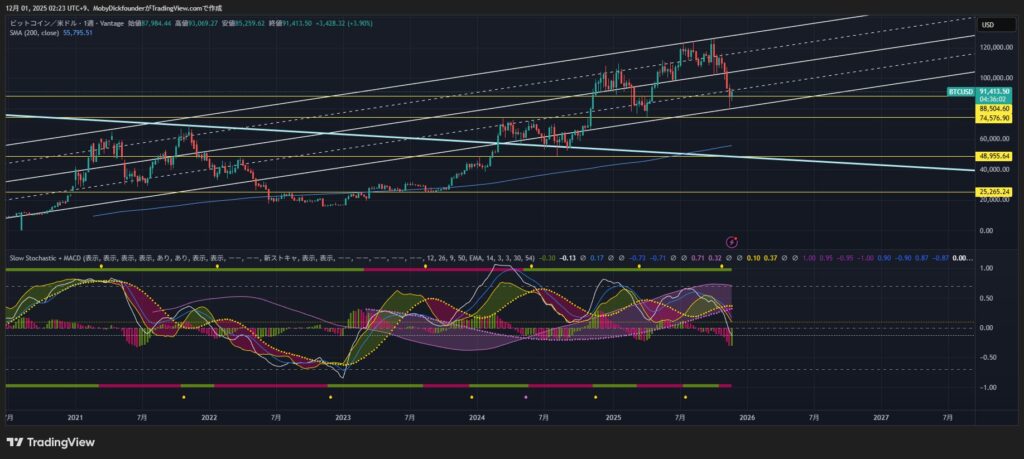 デイトレードの時間軸では、サポレジ転換ラインである89,000ドルが重要なポイントです。