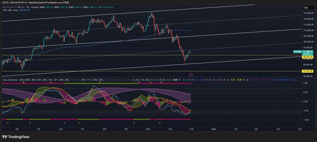 特に200日移動平均線(約11万ドル付近)までの反発上昇はシナリオとして否定できません。