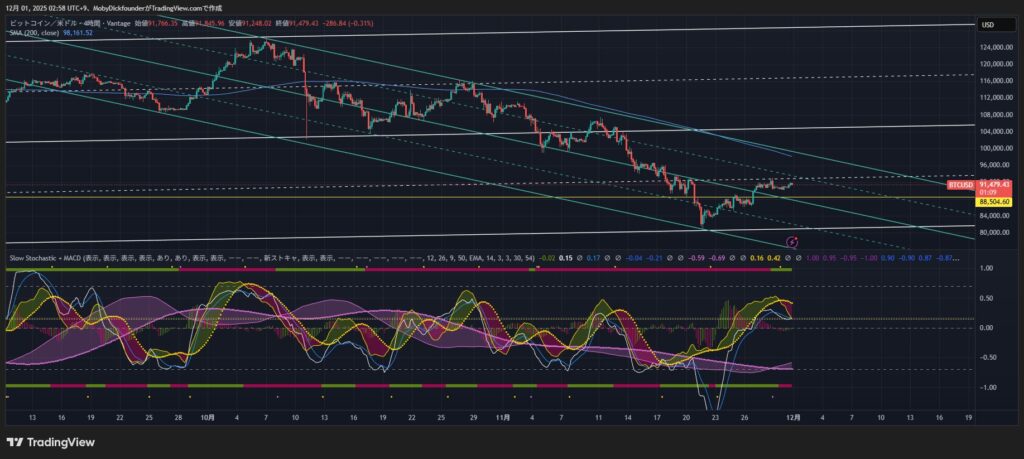 - 4時間足:下降チャネル突破と200日線上抜けが10万ドル回帰の条件