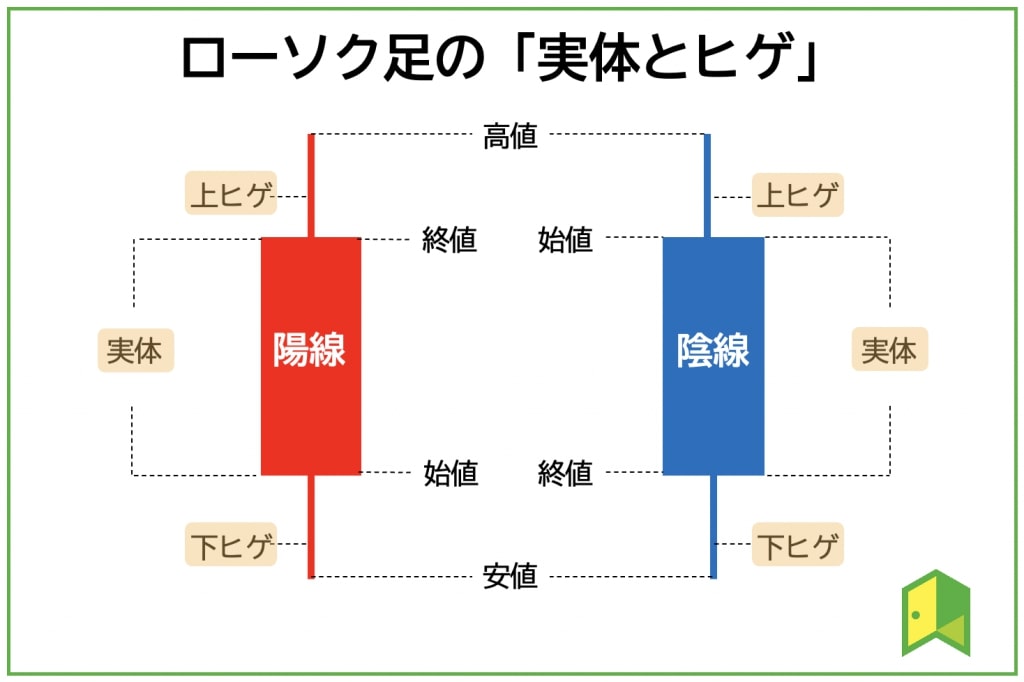 ヒゲ(上下の線):一時的な高値・安値を示す。