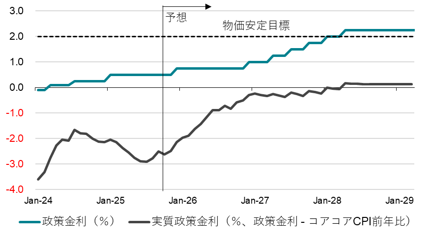 - ② 2026年初までの1回の利上げの後、高市政権の高圧経済の方針の下、利上げは1年間止まる。中立金利に向けた利上げの本格的サイクルに入れるのは、内需の回復がしっかりする2027年からとなる。2%の物価目標に向けた物価上昇率の再拡大で、ゼロ%程度の実質金利に合わせた利上げを継続。実質金利ゼロの維持が、経済活動を促進。2028年には政策金利は2%強となり、実質政策金利は物価目標対比でマイナスを脱する。